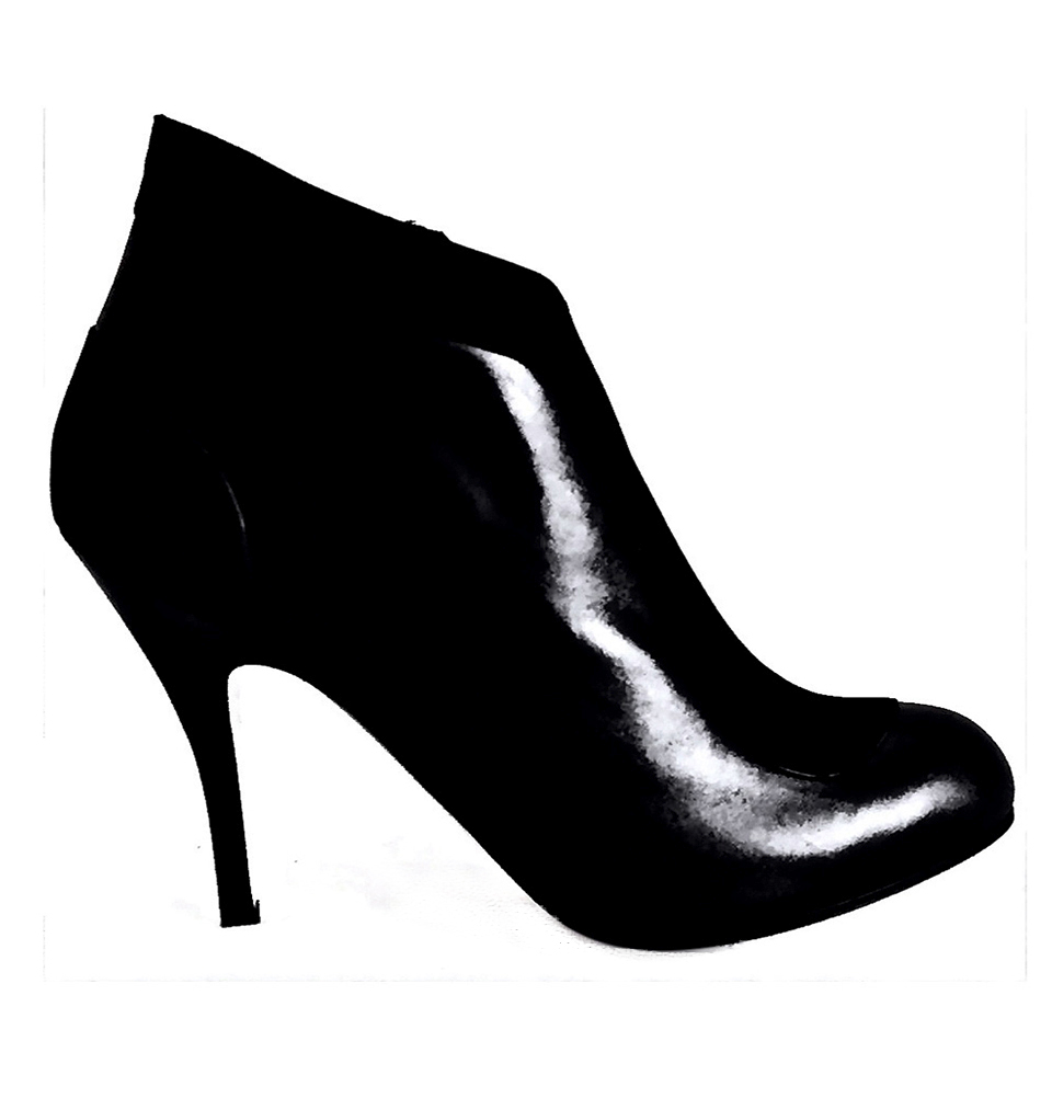 Сапоги из черной блестящей кожи с закругленным мысом, застежка на молнии сбоку, высота по щиколотку. Объединяют традиционные детали, такие как классическая форма, с изысканными элементами. Фурнитура светлого золотистого цвета, каблук средней высоты.