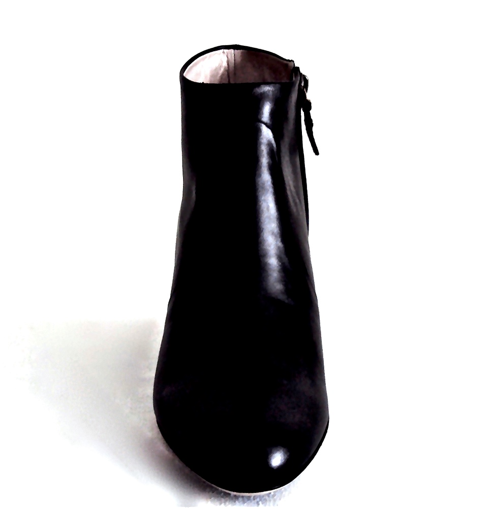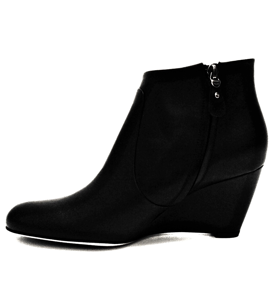 Сапоги Salvatore Ferragamo из черной гладкой кожи имеет закругленней носок, а устойчивая танкетка вносит в дизайн ноту изящества. Практичная застёжка-молния завершает дизайн.