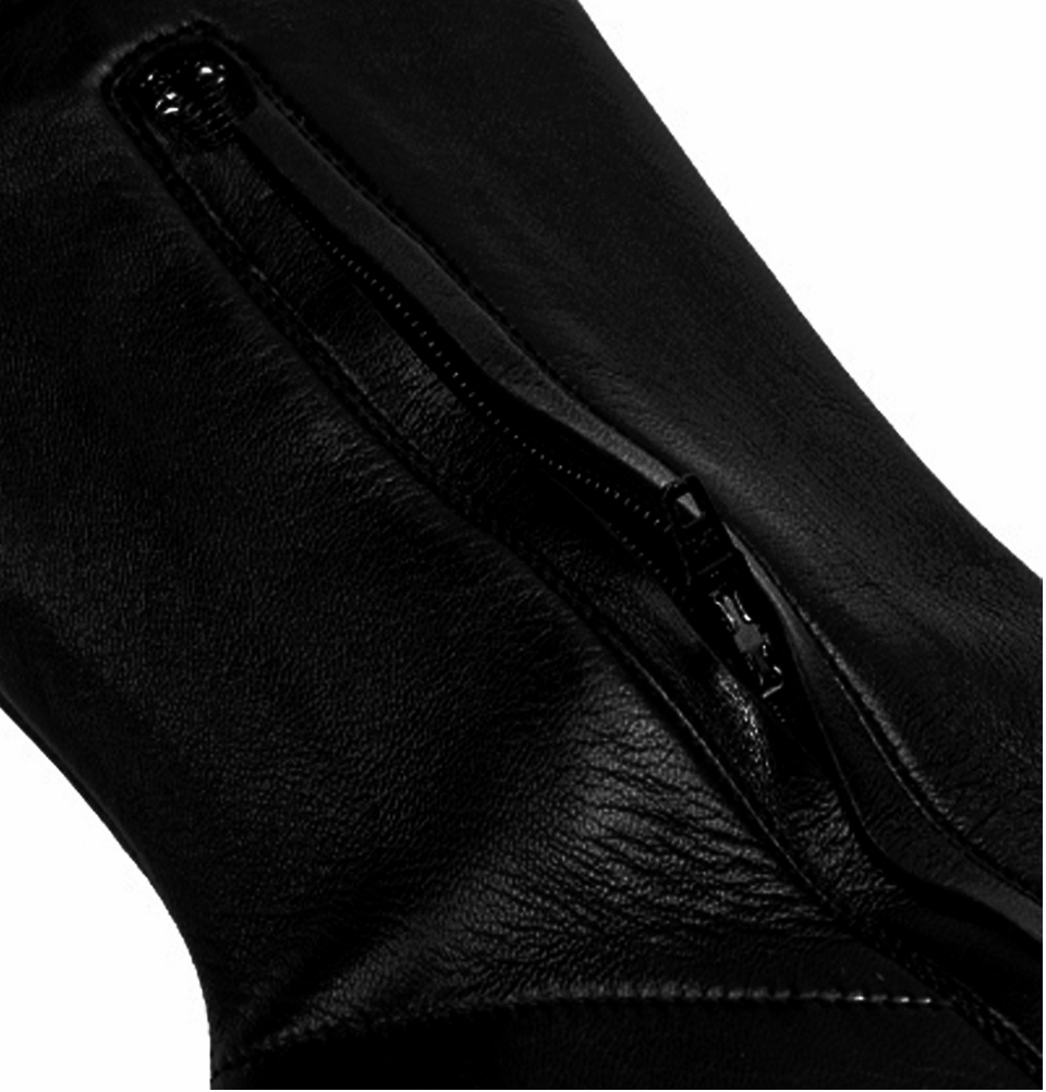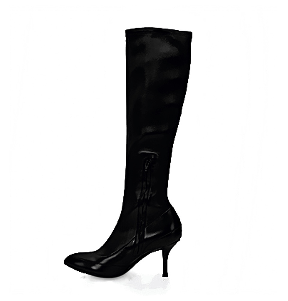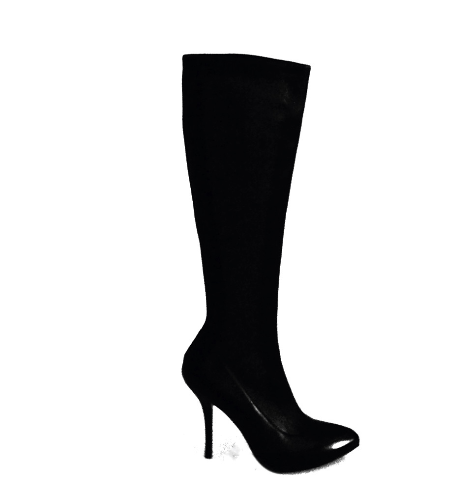 Черный, заостренный носок, высота по колено, кожаная подошва и каблук-шпилька.