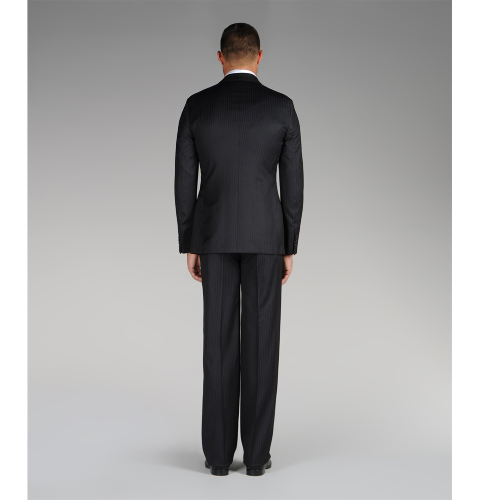 Костюм выполненный из саржи в тонкую полоску, этот костюм отличаются облегающим кроем, повторяющим движения тела. Эта модель в классическом стиле изготовлена по лекалам одежды "от-кутюр". Однобортный пиджак на двух пуговицах характеризуется неклеевой бортовкой, тупоугольными лацканами, прямым контуром плеч и боковыми шлицами сзади. Классические брюки на пуговице представлены центральной стрелкой и поясом с противоусадочной отделкой.